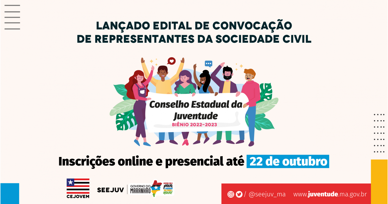 A Secretaria de Estado da Juventude (Seejuv), abre processo de convocação para representantes da Sociedade Civil em uma nova composição do O Conselho Estadual da Juventude (CEJOVEM) biênio 2022-2023, o mesmo é um espaço de participação e interlocução da juventude com o poder público no planejamento e acompanhamento da execução das Políticas Públicas de Juventude.